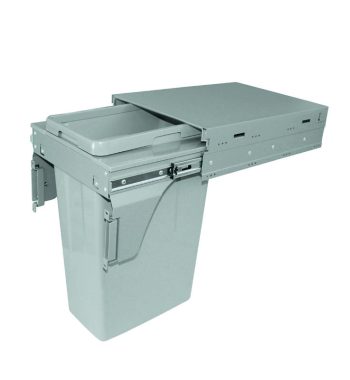Bote de basura ecológico para interior de gabinete ideal para la separación y reciclado de basura. Herraje con tapa integrada para conservar los malos olores dentro del contenedor. Durabilidad y resistencia a líquidos.